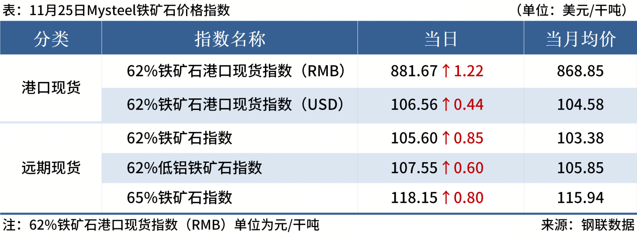 ◎ 11月25日,Mysteel進(jìn)口鐵礦石62%澳洲粉礦遠(yuǎn)期現(xiàn)貨指數(shù)105.6美元/干噸,漲0.85美元/干噸;65%巴西粉礦遠(yuǎn)期現(xiàn)貨指數(shù)118.15美元/干噸,漲0.8美元/干噸。