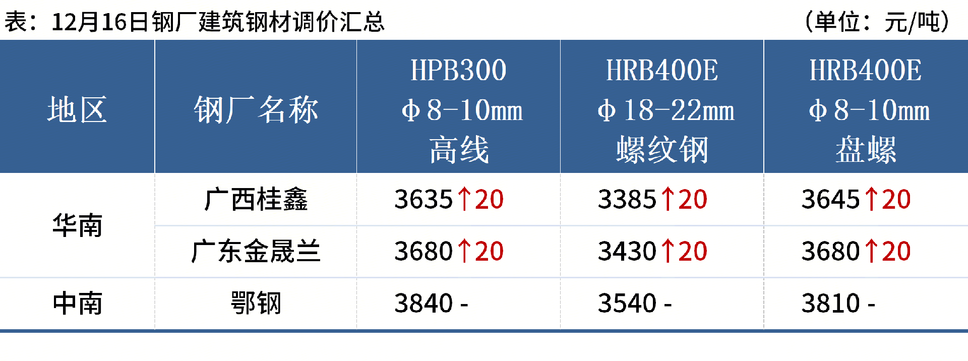 ◎云南區(qū)域主要建筑鋼材生產(chǎn)企業(yè)對建筑鋼材產(chǎn)品各規(guī)格價差作調(diào)整:Ф18規(guī)格上調(diào)200元/噸,Ф20規(guī)格不變,其余規(guī)格上調(diào)100元/噸,本次調(diào)整以HRB400EФ20為基準價格,其他規(guī)格在此基礎上按極差加價。詳情>>