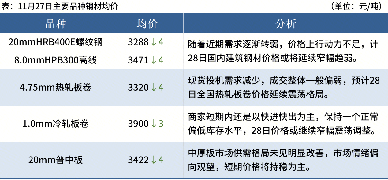 ◎ 11月27日,全國主港鐵礦石成交119.10萬噸,環(huán)比增15.3%;237家主流貿(mào)易商建筑鋼材成交9.27萬噸,環(huán)比減0.6%。