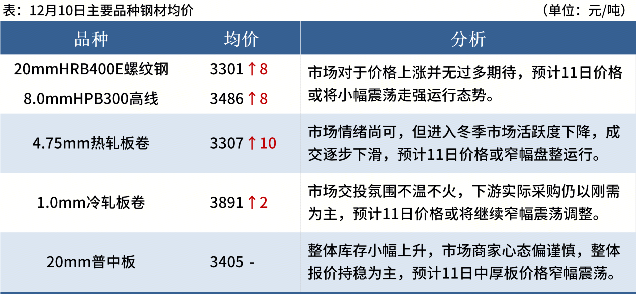 ◎ 12月10日,中天鋼鐵出臺12月中旬價格,螺紋鋼、線材、盤螺均上調(diào)50元/噸。華東螺紋鋼3400元/噸、線材盤螺3600元/噸。