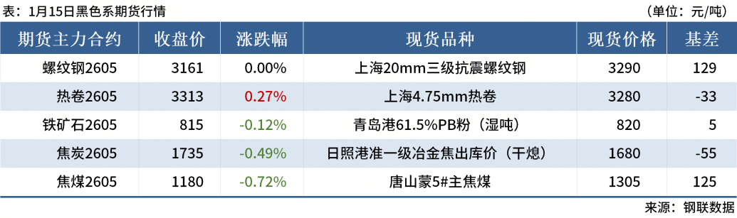 ◎1月15日,全國(guó)主港鐵礦石成交98.12萬(wàn)噸,環(huán)比減20.3%;237家主流貿(mào)易商建筑鋼材成交8.62萬(wàn)噸,環(huán)比減2.7%。